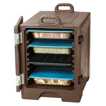 Insulated food pan carrier. Holds 5 full pans or 10 half pans. It will hold the food at temperature for up to 4 hours.